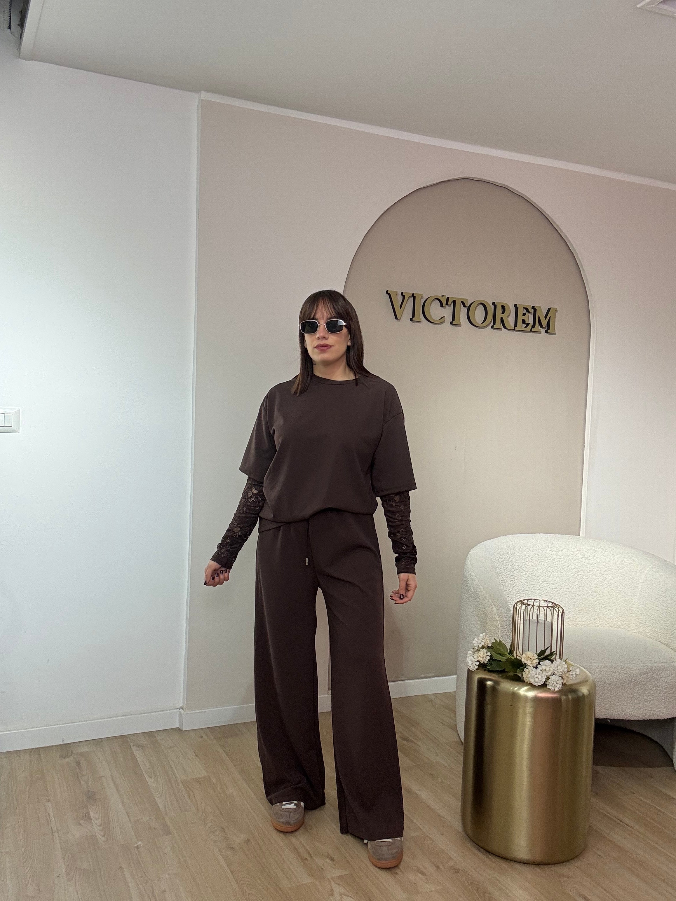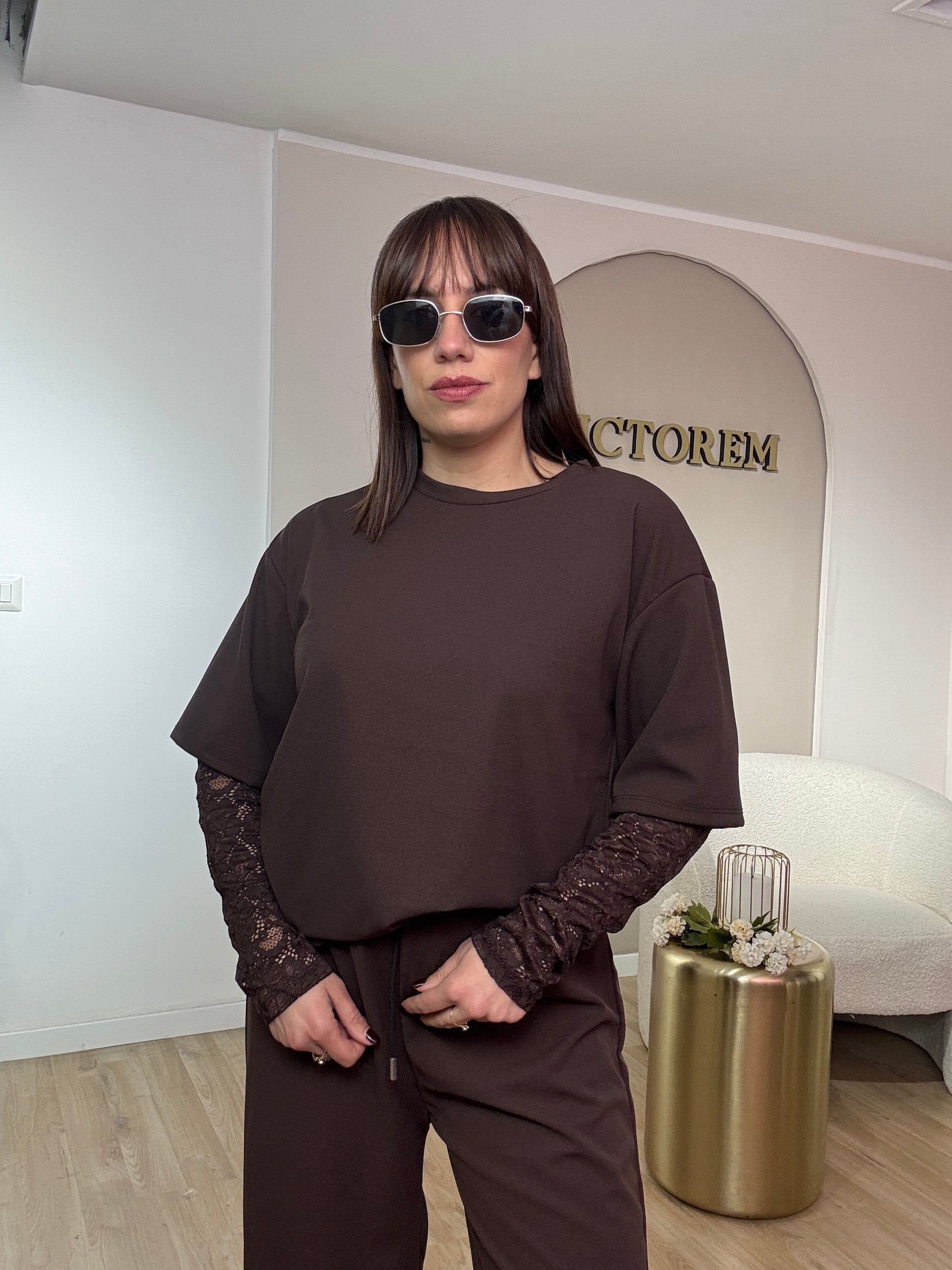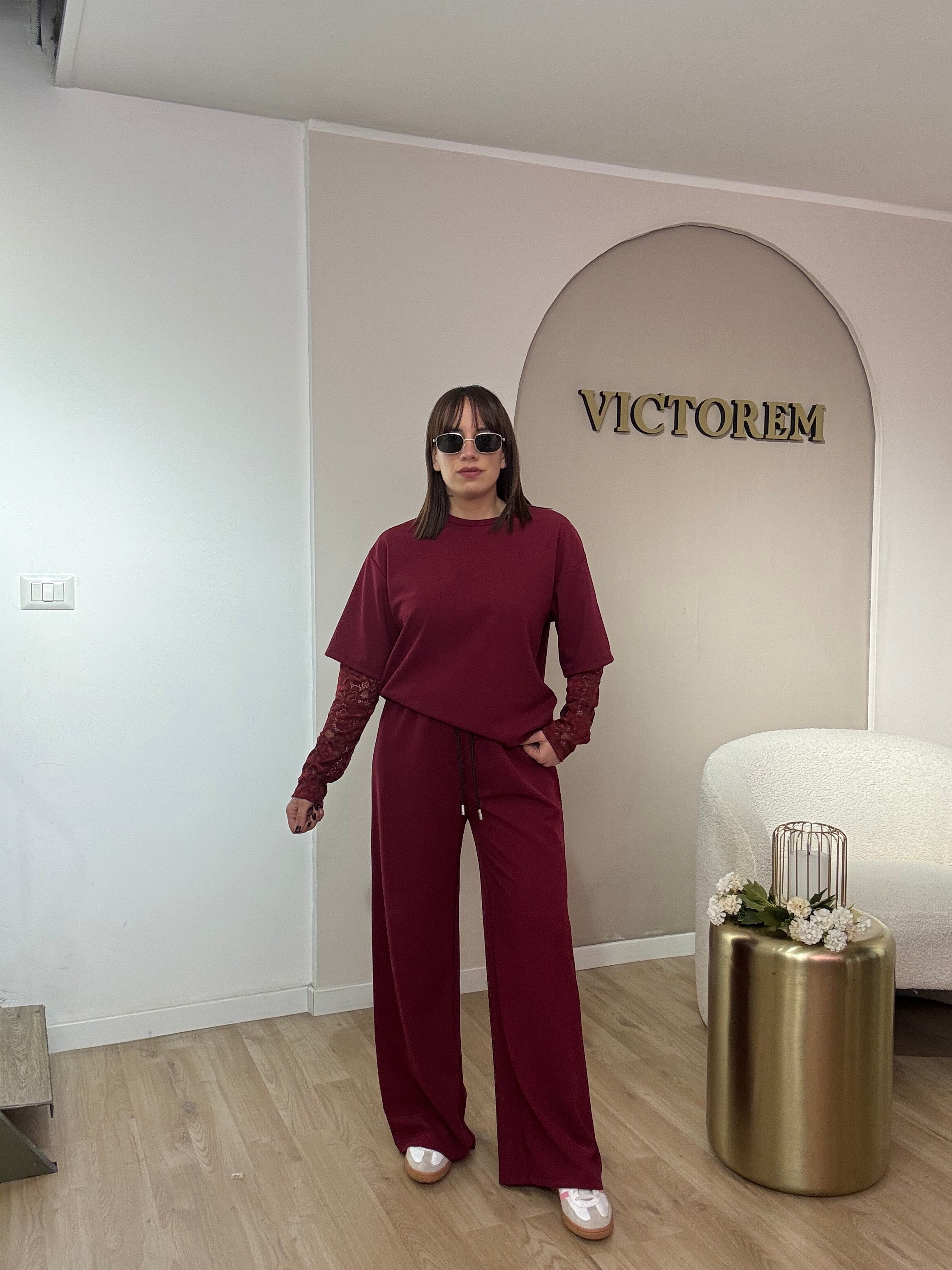 Coordinato  composto da pantalone palazzo con elastico e laccio in vita e maglia con manica in pizzo , vestibilità fino ad una tg 46 abbondante