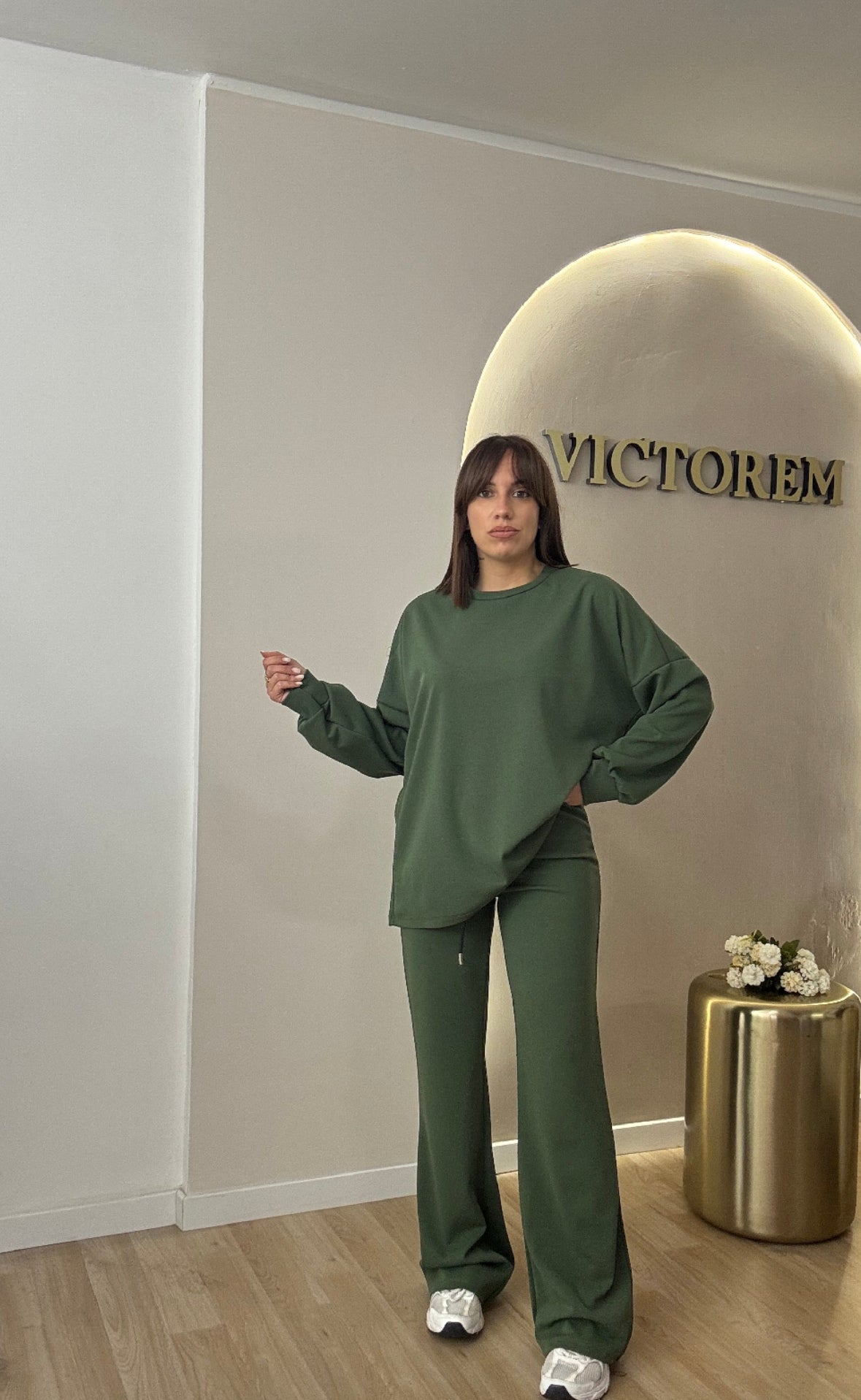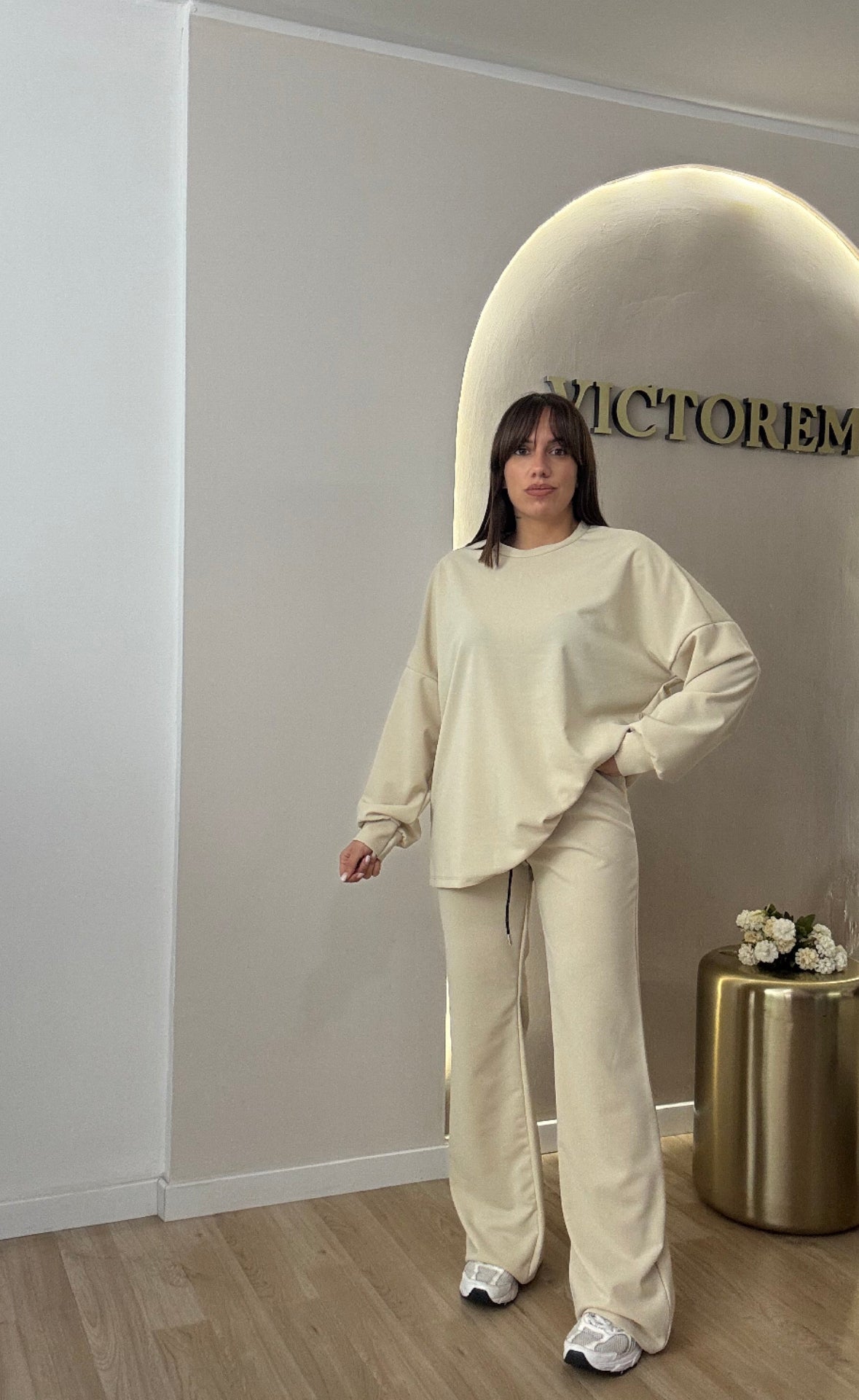 Coordinato tessuto garzato con elastico in vita e laccio, veste fino ad una tg 46