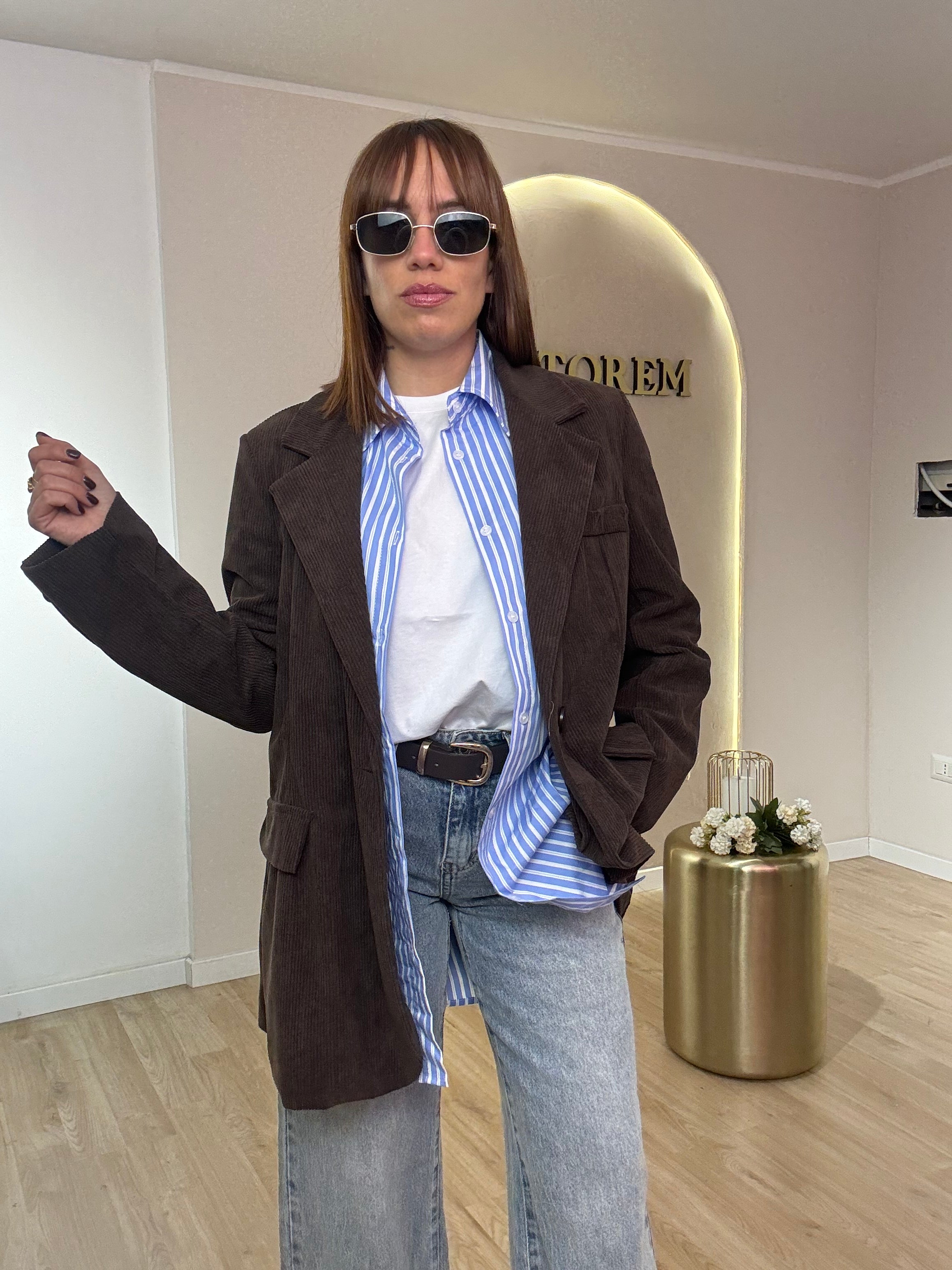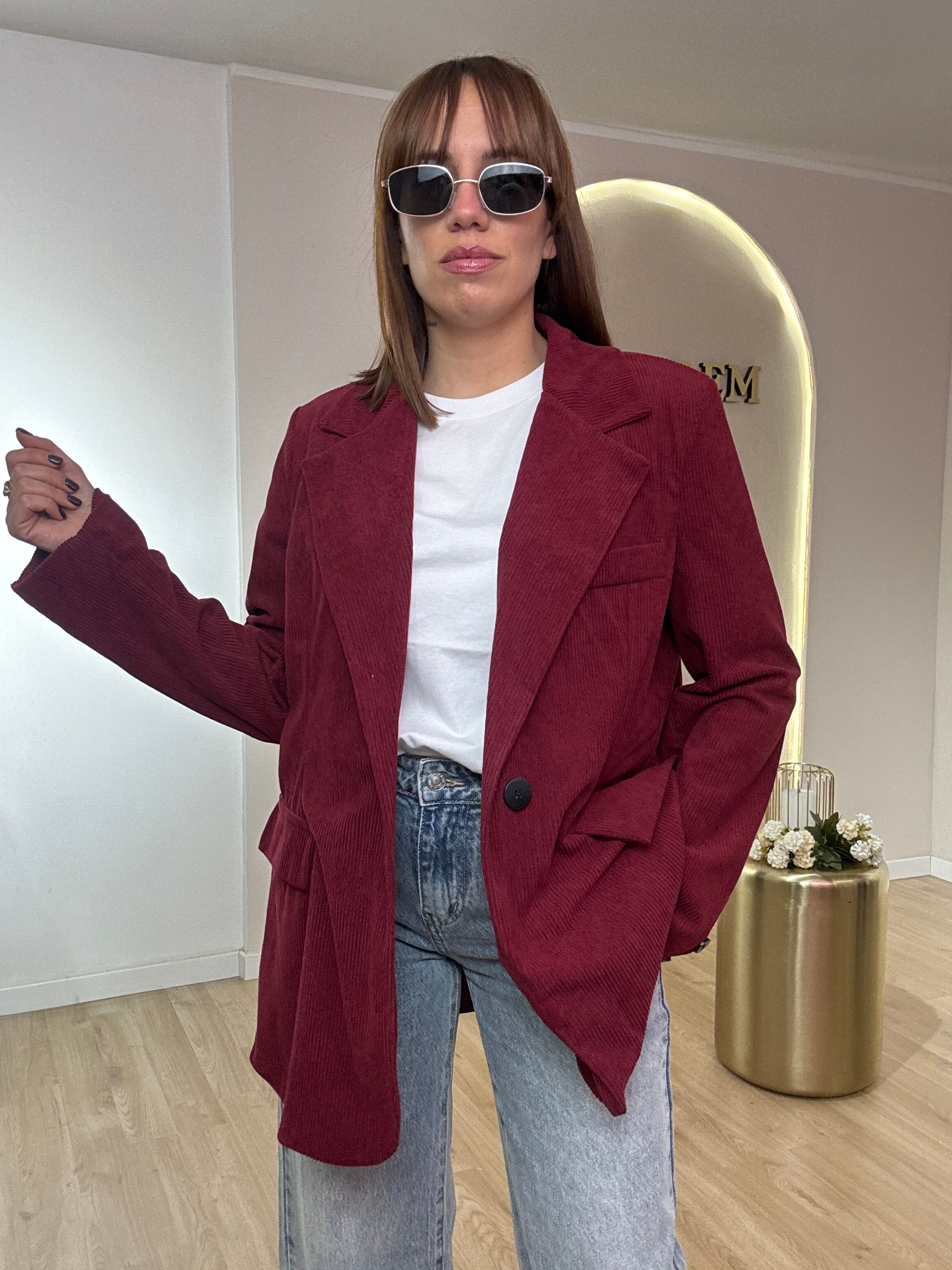 Giacca a costine in velluto con spallina strutturata e foderata internamente. Chiusura con bottone centrale e tasche finte. Veste fino a una taglia 46