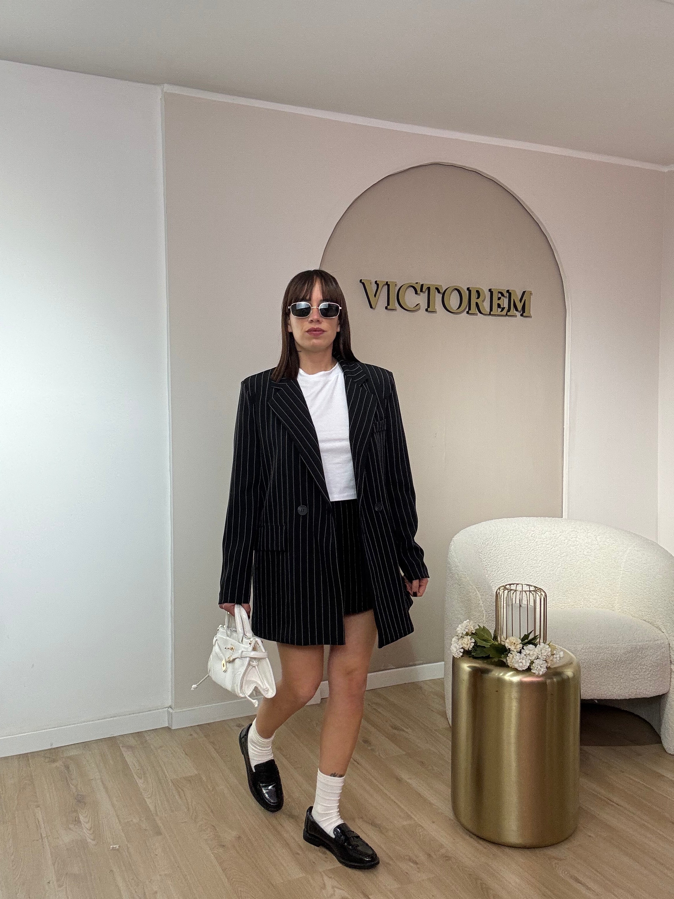 Giacca con stampa gessata con bottoni e spallina preformata. Foderata internamente, veste fino a una taglia 46