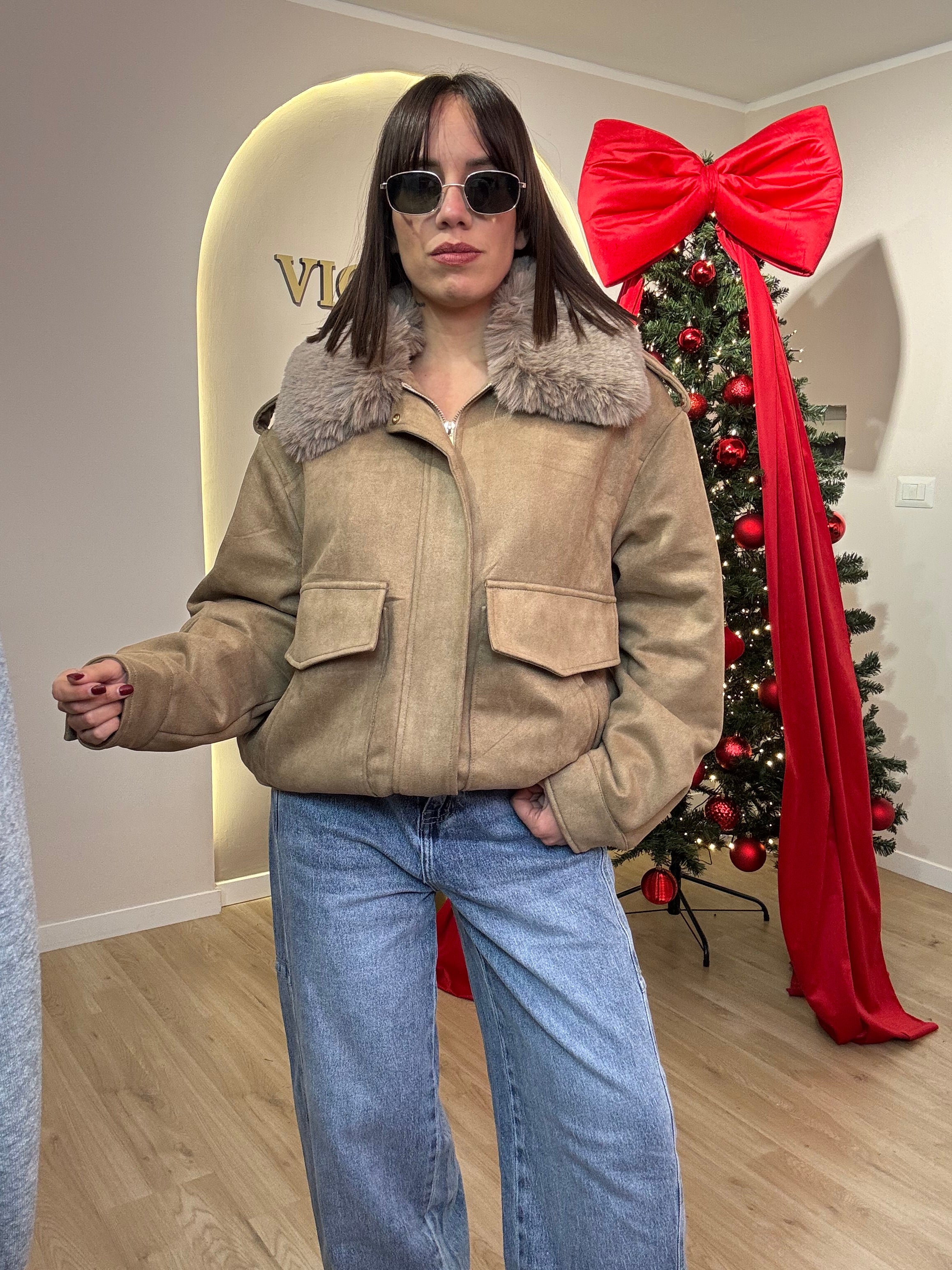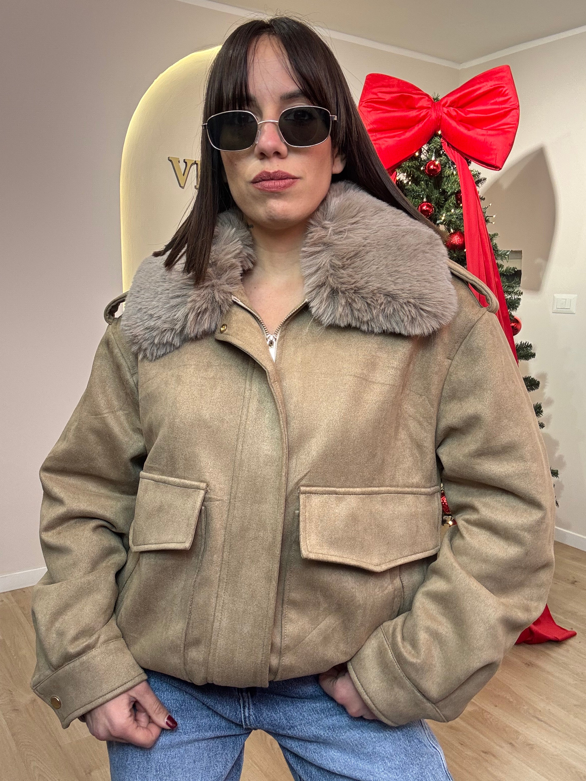 Giubbino in camoscio con interno e  colletto in pelliccia. Zip e tasche. Veste fino a una taglia 46