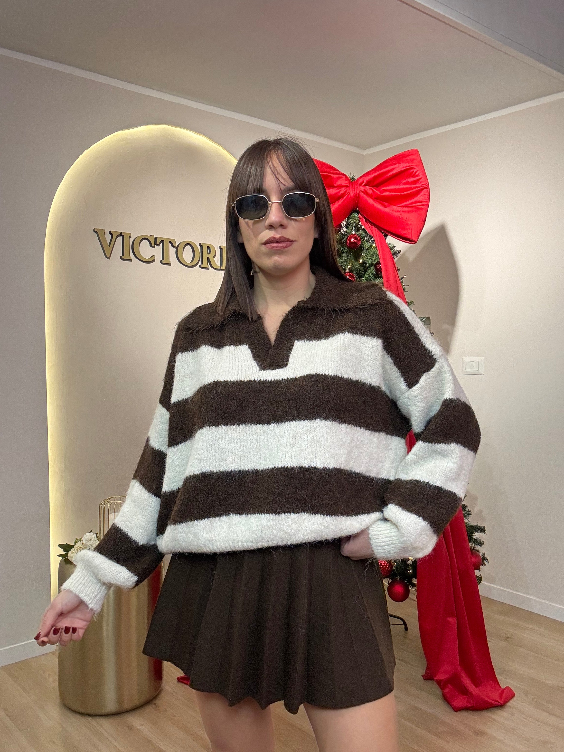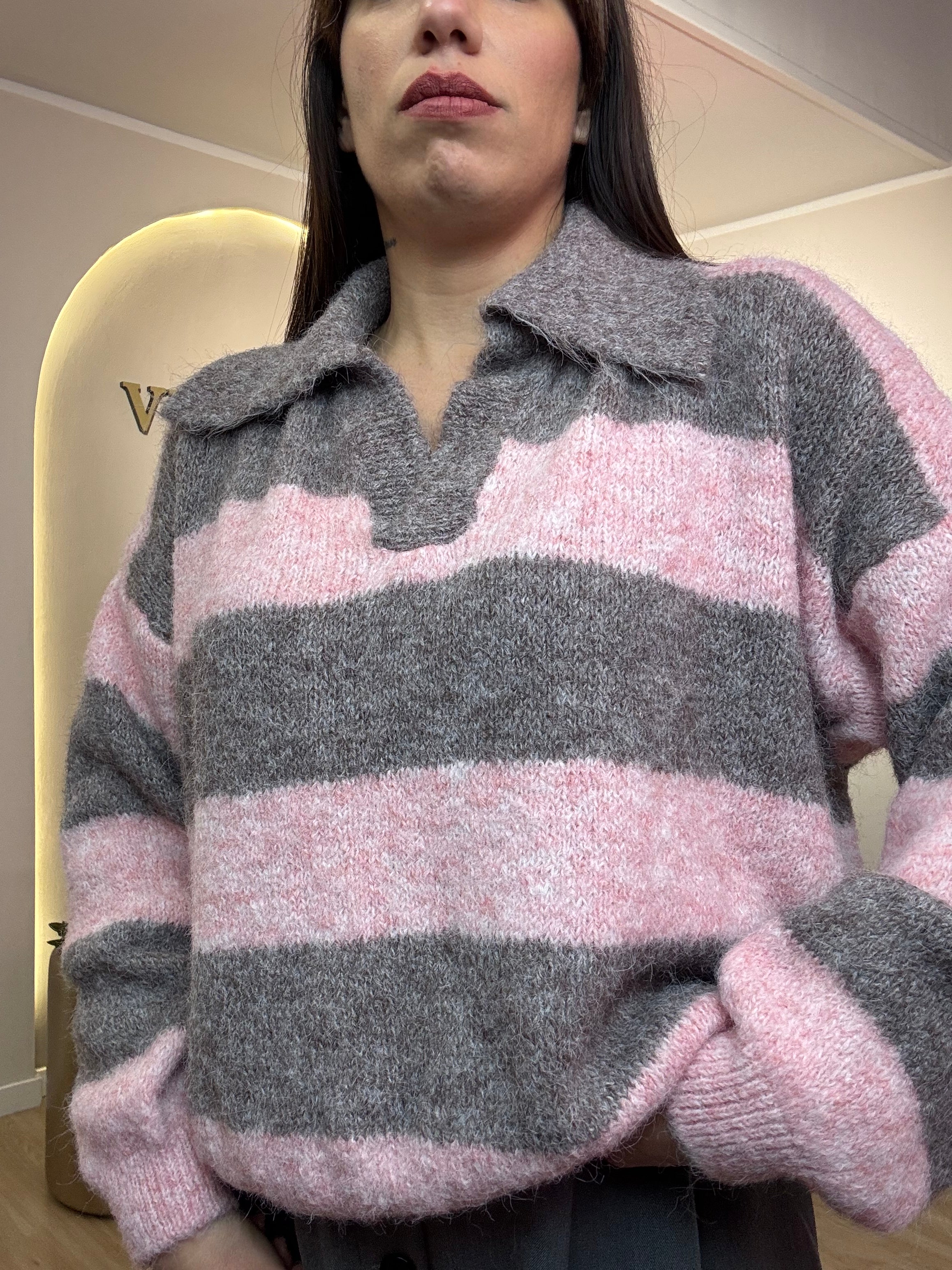Maglia polo in lana grossa righe. Veste fino a una taglia 48.