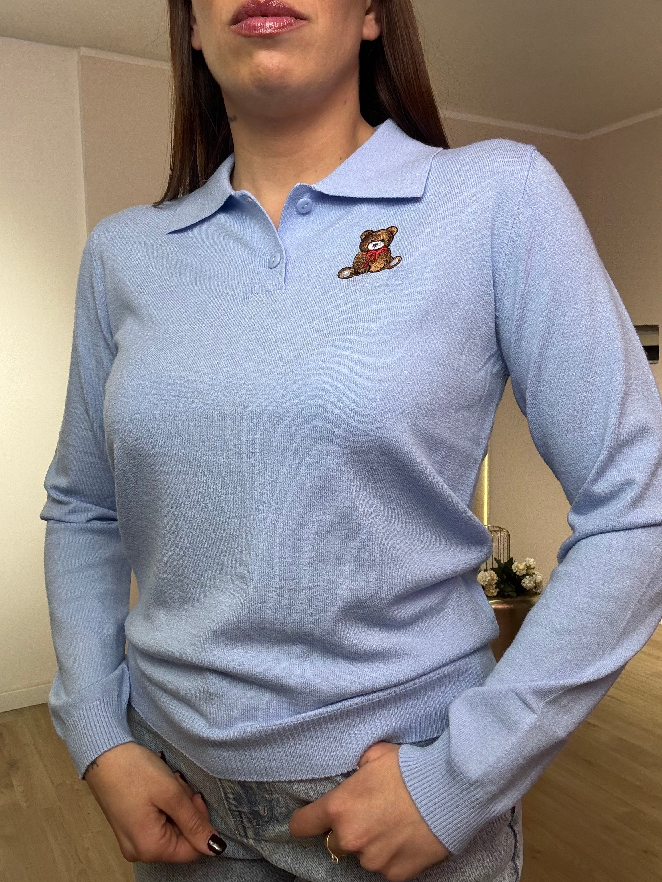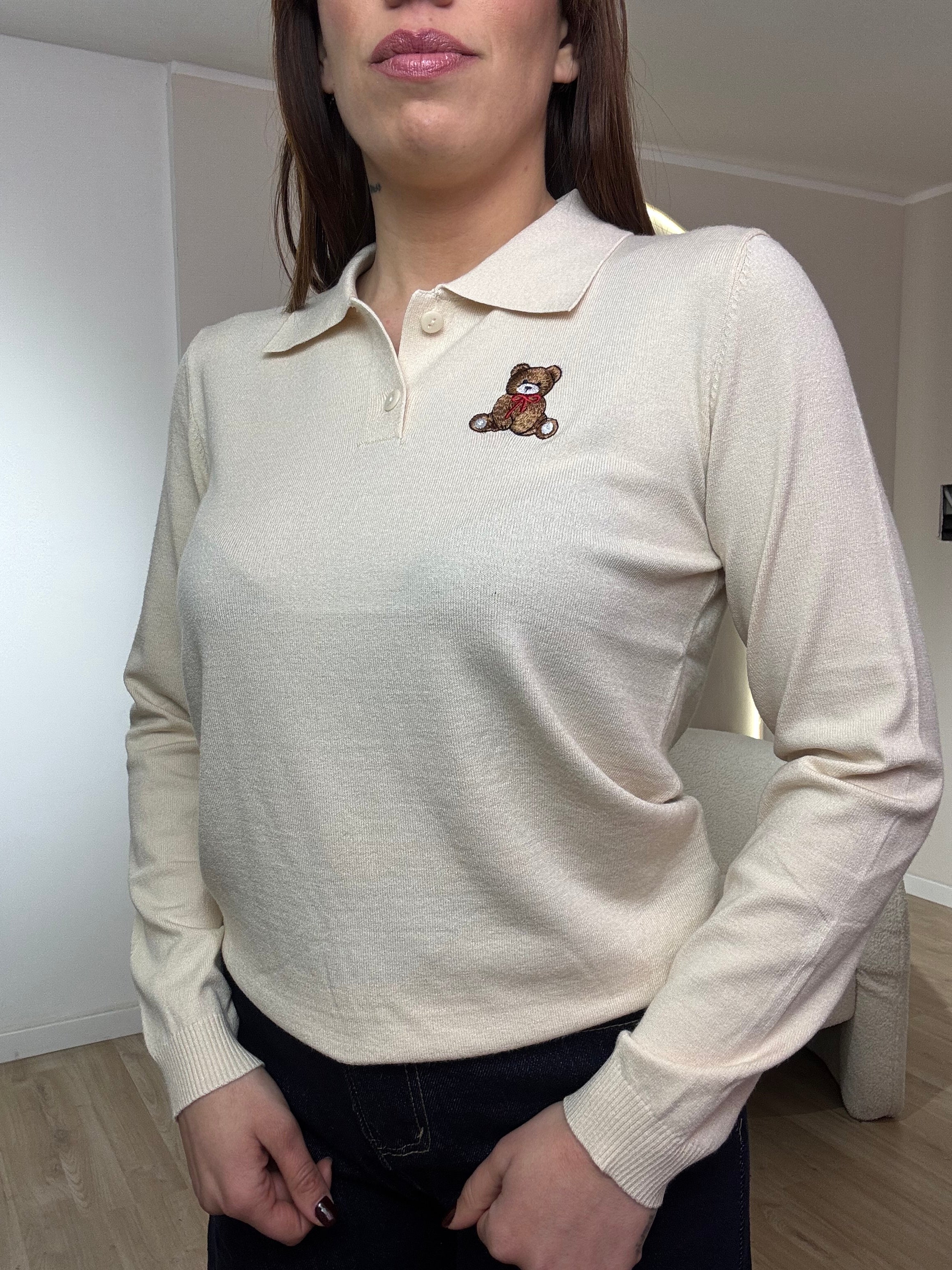 Polo in lana rasata con patch teddy e bottoncini. Veste fino a una taglia 46
