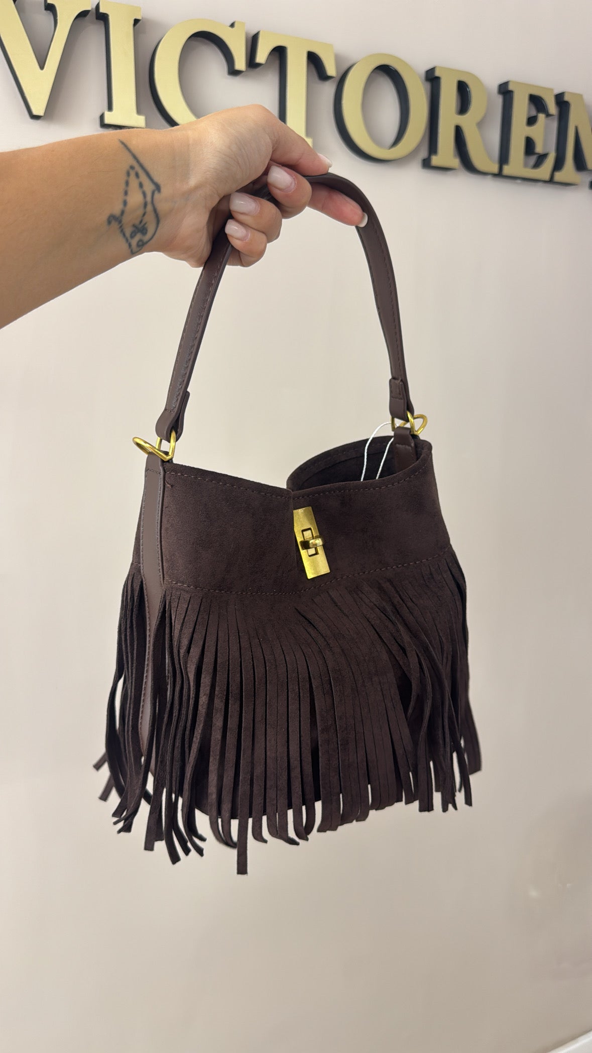 Secchiello con frange in dainetto con tracolla e borsellino interno .