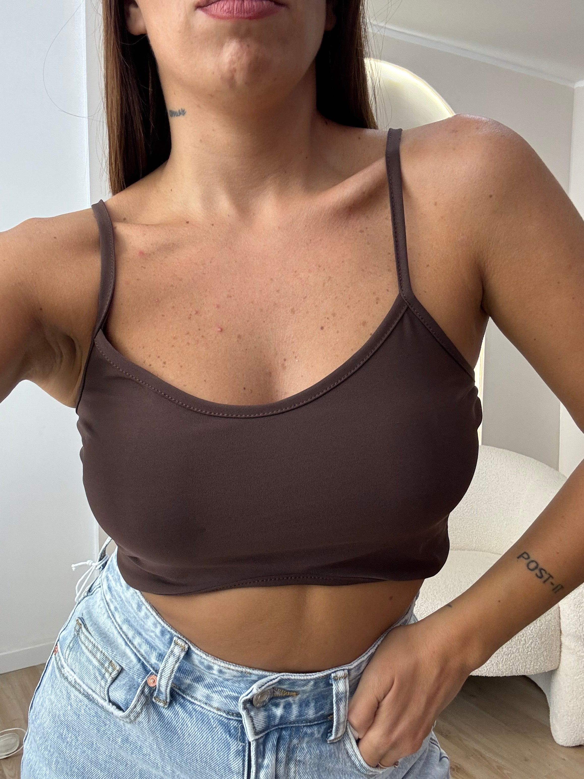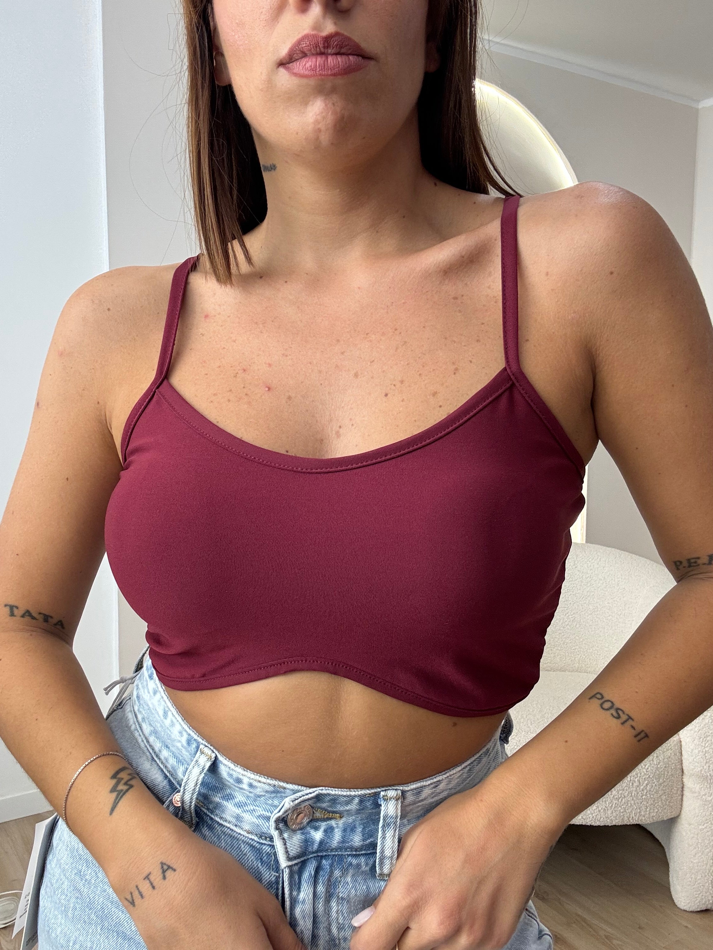 Top in lycra spallina sottile e coppe preformate ,  esce fino ad una tg 46 , 4 ‘ di seno.