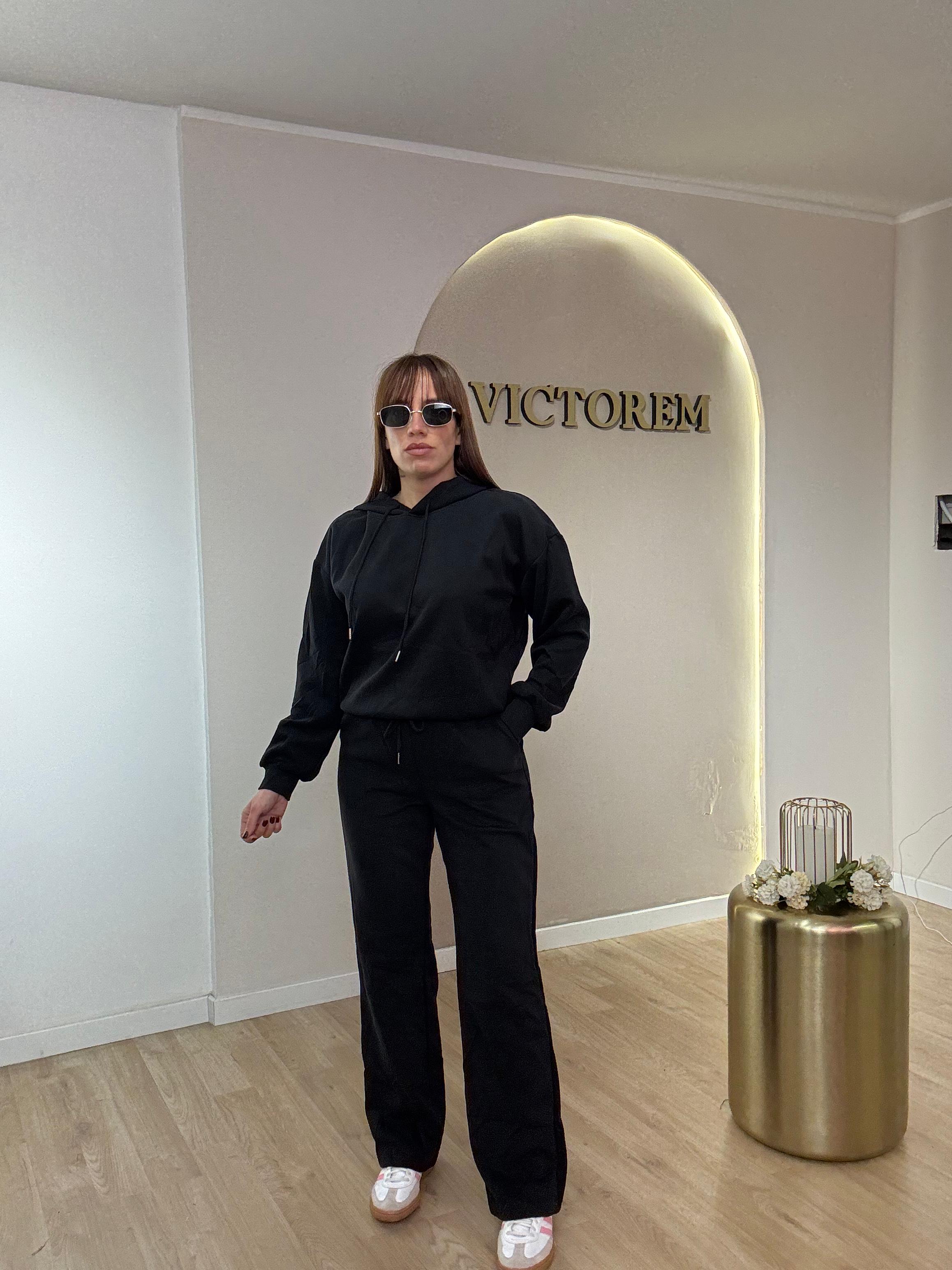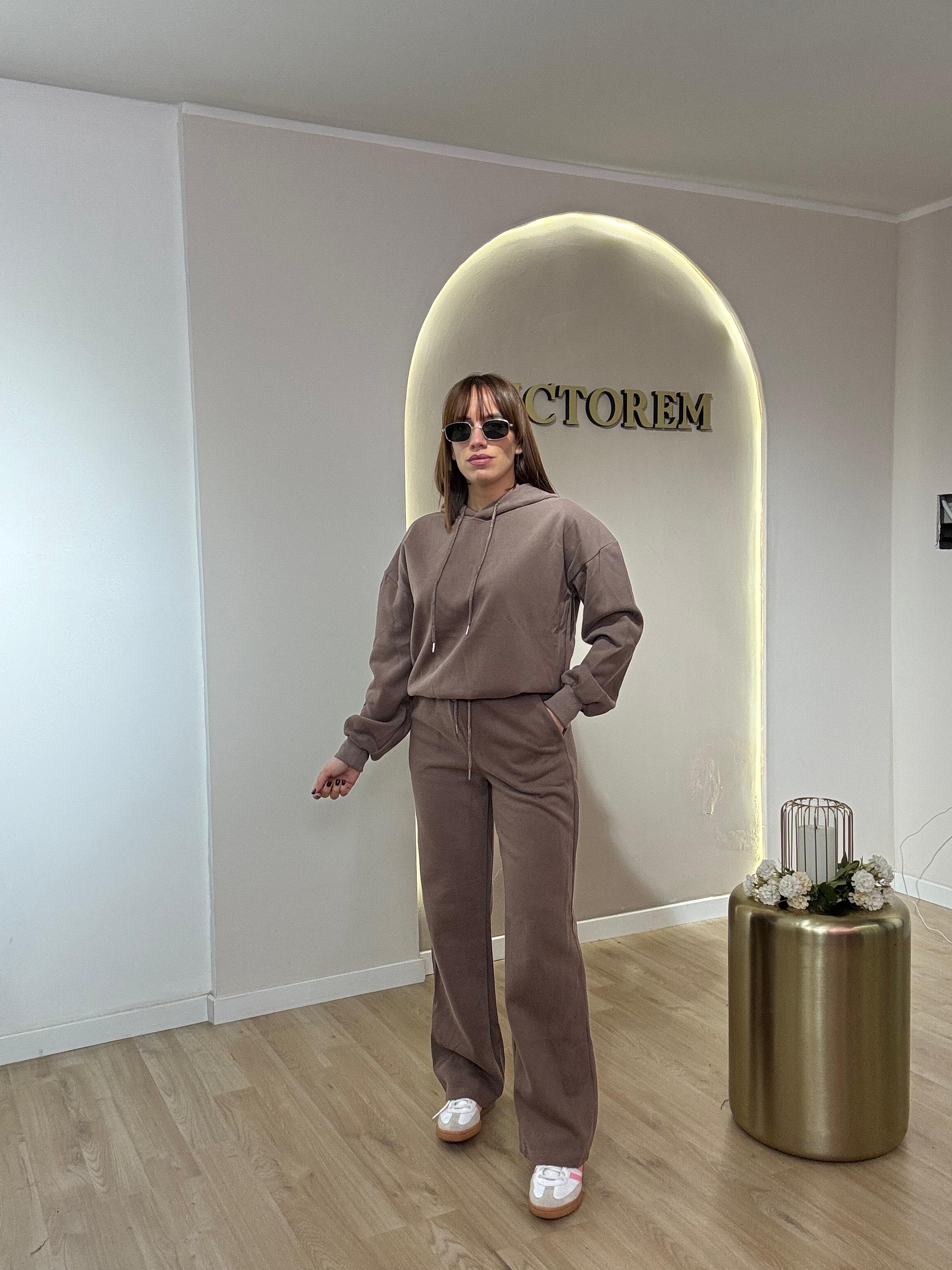 Tuta composta da pantalaccio elasticizzato e felpa con cappuccio.