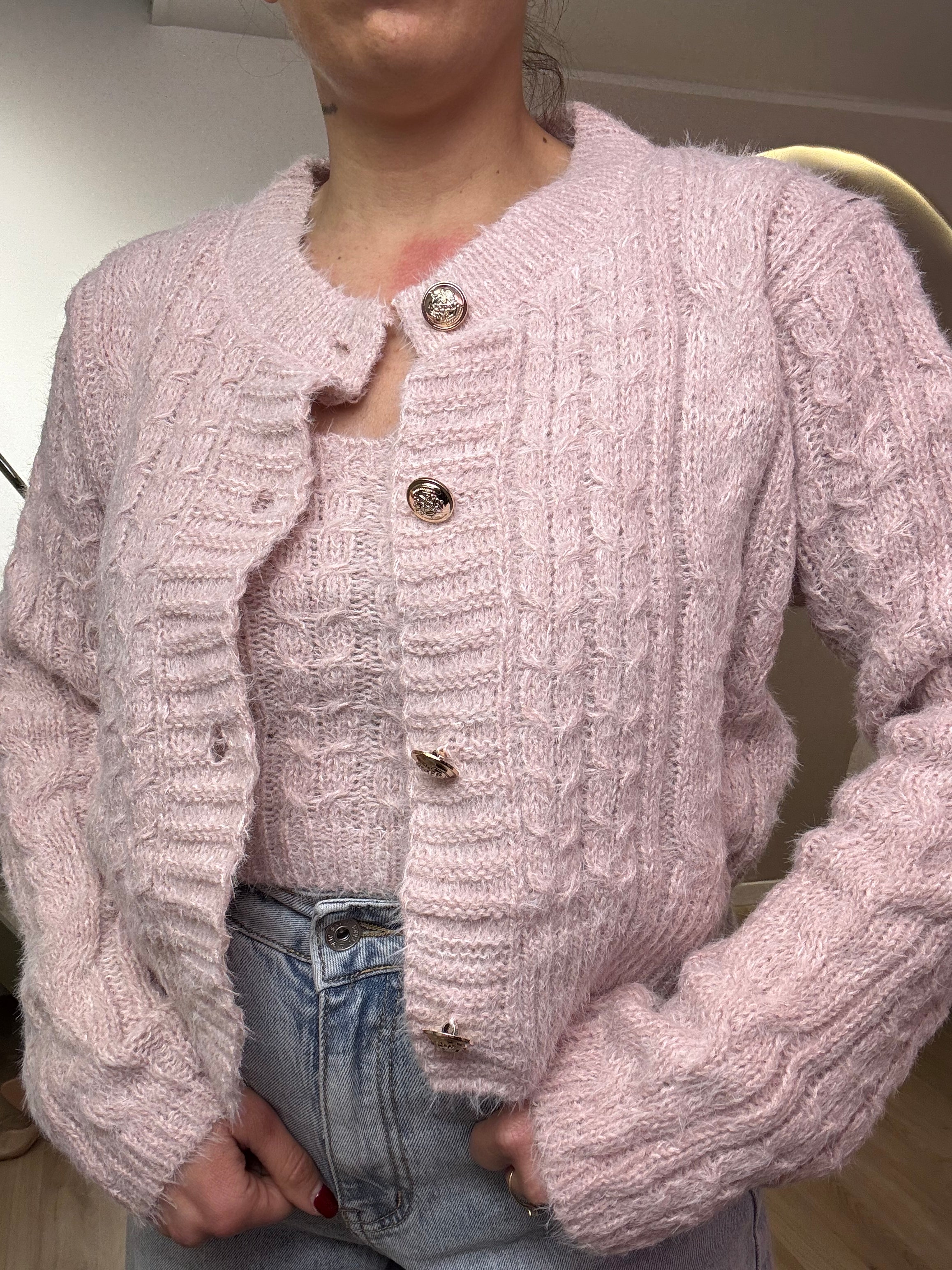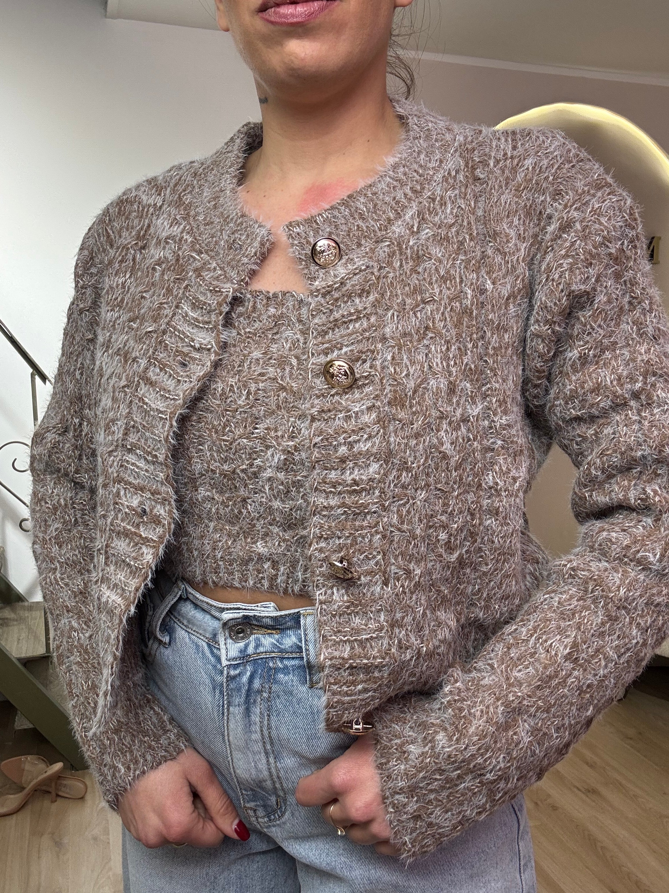 Twinset con bottoni gold, composto da top e cargigan. Veste fino a una taglia 44