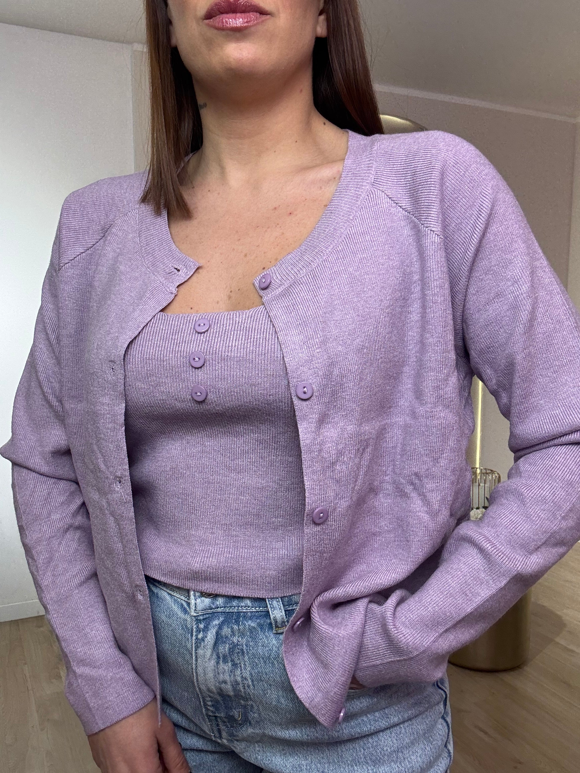 Twinset composto da top e cardigan con bottoncini. Veste fino a una taglia 46